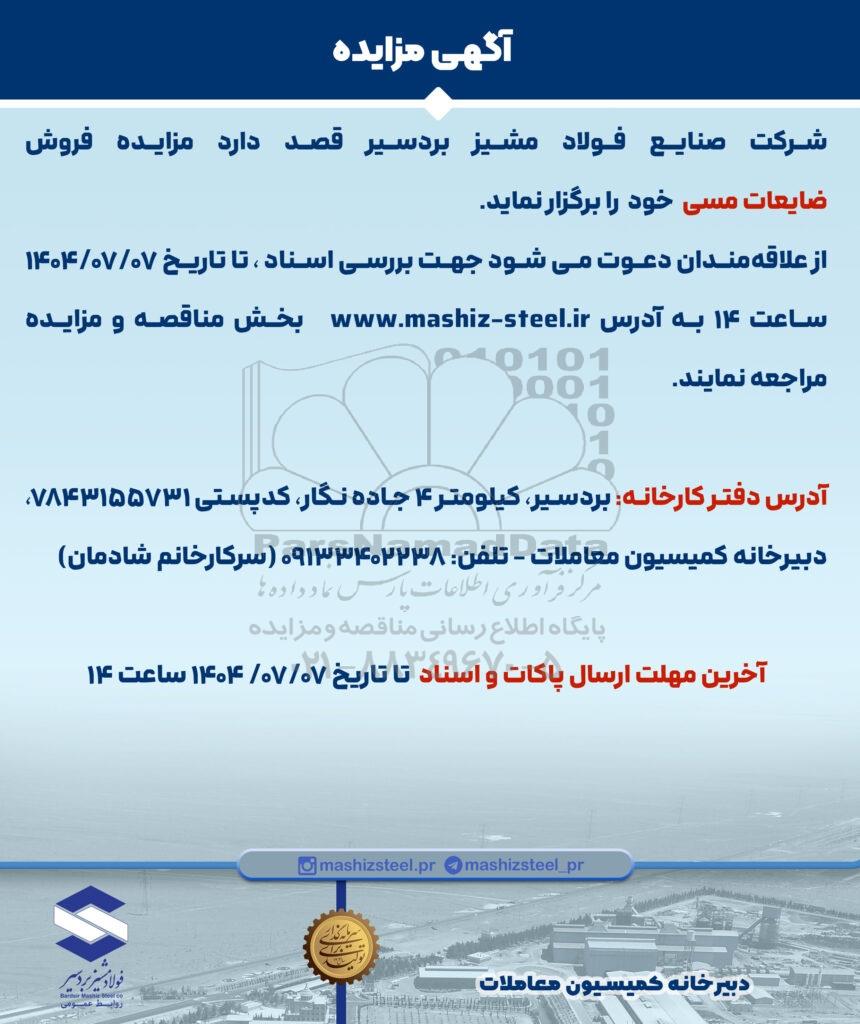 از علاقه مندان دعوت میشود جهت بررسی اسناد تا تاریخ 1404.07.07 ساعت 14 به آدرس www.mashiz-steel.ir بخش مناقصه و مزایده مراجعه نمایند.