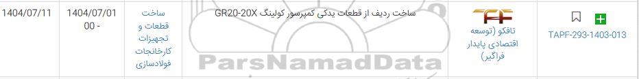 | TAPF - 293 - 1403 - 013 | تافکو (توسعه اقتصادی پایدار فراگیر) | ساخت ردیف از قطعات یدکی کمپرسور لوب تایپ کولینگ GR20-20X | ساخت قطعات و تجهیزات کارخانجات فولادسازی | 1404.07.01 | 1404.07.11 |