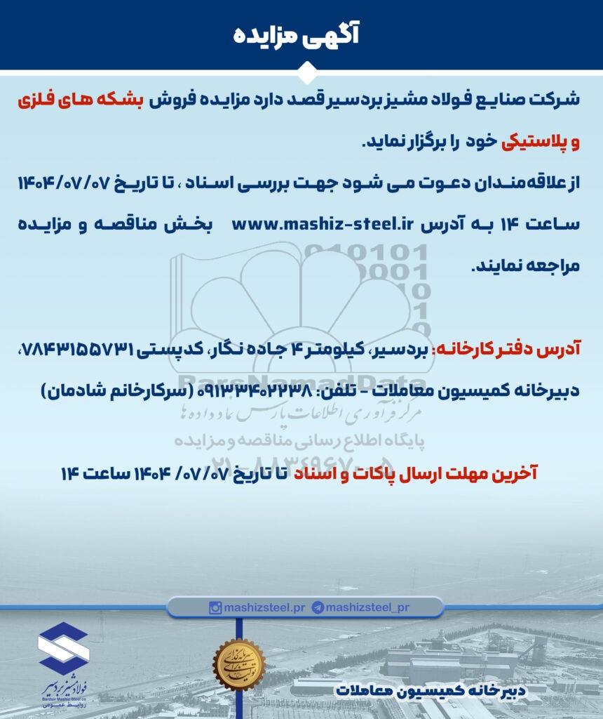 از علاقه مندان دعوت می شود جهت بررسی اسناد تا تاریخ 1404.07.07 ساعت 14 به آدرس www.mashiz-steel.ir بخش مناقصه و مزایده مراجعه نمایند.