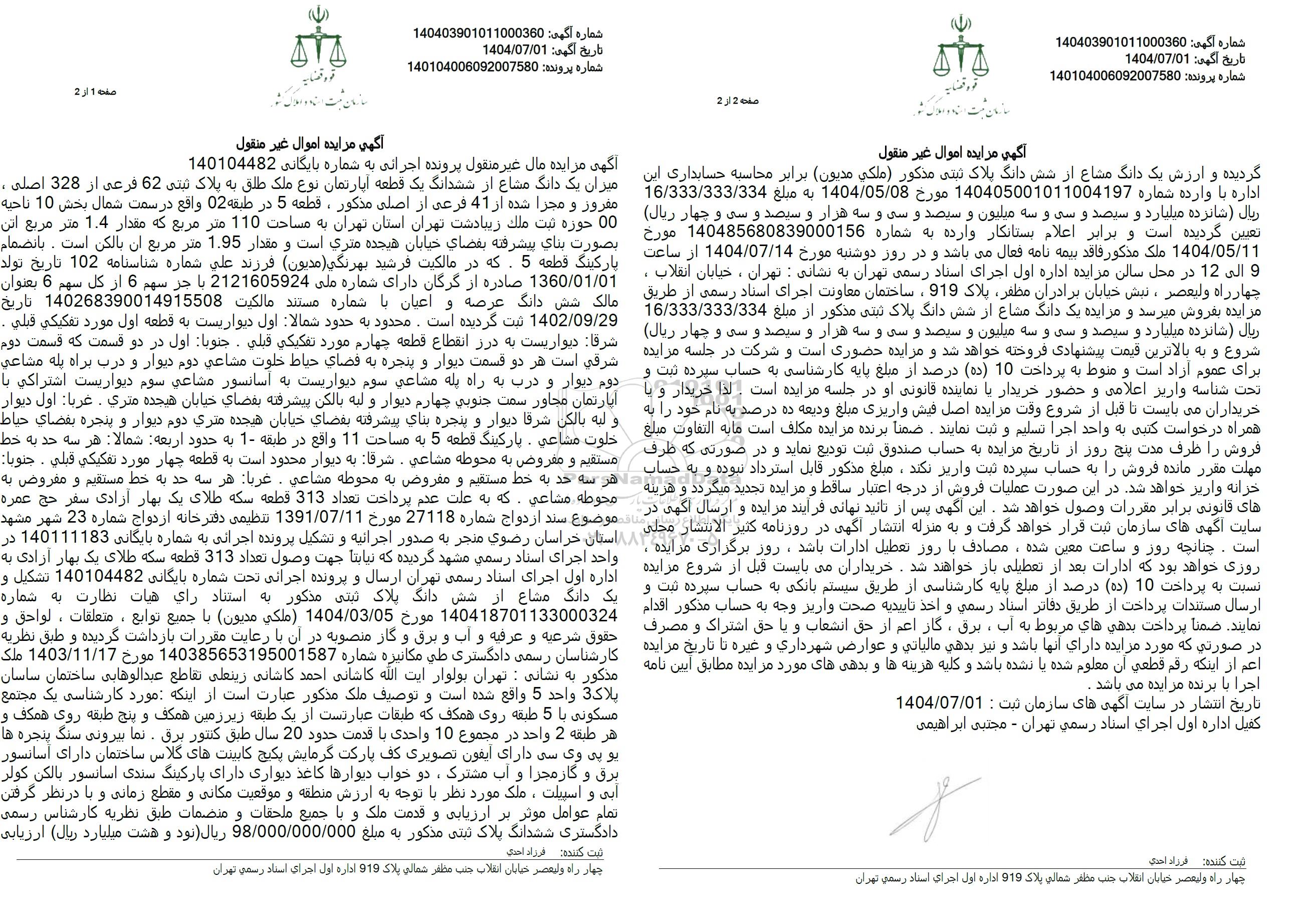 گردیده و ارزش یک دانگ مشاع از شش دانگ پلاک ثبتی مذکور (ملكي ممنون) برابر محاسبه حسابداری این 16.333.333.334 اداره با وارده شماره 140405001011004197 مورخ 1404.05.08 به مبلغ کار وارده به شماره 140485680839000156 مورخ ریال شانزده میلیارد و سیصد و سی و سه میلیون و سیصد و سی و سه هزار و سیصد و سی و چهار (ریال) تعیین گردیده است و برابر اعلام بستانکار وارده 1404.05.11 ملک مذکور فاقد بیمه نامه فعال می باشد و در روز دوشنبه مورخ 1404.07.14 از ساعت 9 الی 12 در محل سالن مزایده اداره اول اجرای اسناد رسمی تهران به نشانی : تهران ، خیابان انقلاب ، چهارراه ولیعصر ، ليس خیابان برادران مظفر، پلاک 919، ساختمان معاونت اجرای اسناد رسمی از طریق مزایده بفروش میرسد و مزایده یک دانگ مشاع از شش دانگ پلاک ثبتی مذکور از مبلغ 16.333.333.334 ریال شانزده میلیارد و سیصد و سی و سه میلیون و سیصد و سی و سه هزار و سیصد و سی و چهار (ریال) شروع و به بالاترین قیمت پیشنهادی فروخته خواهد شد و مزایده حضوری است و شرکت در جلسه مزایده برای عموم آزاد است و ضوط به پرداخت 10 (ده) درصد از مبلغ پایه کارشناسی به حساب سپرده ثبت و تحت شناسه وازیر اعلامی و حضور خریدار با نماینده قانونی او در جلسه مزایده است . لذا خریدار و با خریداران می بایست تا قبل از شروع وقت مزایده اصل فیش واریزی مبلغ ودیعه ده درصد به نام خود را به همراه درخواست کتبی به واحد اجرا تسلیم و ثبت نمایند. ضمنا برنده مزایده مکلف است مابه التفاوت مبلغ فروش را ظرف مدت پنج روز از تاریخ مزایده به حساب صندوق ثبت تودیع نماید و در صورتی که طرف مهلت مقرر مانده فروش را به حساب سپرده ثبت واریز نکند، مبلغ مذکور قابل استرداد نبوده و به حساب حرانه واریز خواهد شد. در این صورت عملیات فروش از درجه اعتبار ساقط و مزایده تجدید میگردد و هزینه های قانونی برابر مقررات وصول خواهد شد. این آگهی پس از تائید نهایی فرایند مزایده و ارسال آگهی در سایت آگهی های سازمان ثبت قرار خواهد گرفت و به منزله انتشار آگهی در روزنامه كثير الانتشار محلی است. چنانچه روز و ساعت معین شده، مصادف با روز تعطیل ادارات باشد، روز برگزاری مزایده . روزی خواهد بود که ادارات بعد از تعطیلی باز خواهند شد. خریداران می بایست قبل از شروع مزایده نسبت به پرداخت 10 (ده) درصد از مبلغ پایه کارشناسی از طریق سیستم بانکی به حساب سپرده ثبت و ارسال مستندات پرداخت از طریق دفاتر اسناد رسمي و اخذ تابيعيه صحت واریز وجه به حساب مذکور اقدام نمایند. ضمنا پرداخت بدهي هاي مربوط به آب، برق ، گار اعم از حق انشعاب و یا حق اشتراک و مصرف در صورتی که مورد مزایده دارای آنها باشد و نیز بدهی مالیاتی و عوارض شهرداری و غیره تا تاریخ مزایده اعم از اینکه رقم قطعی آن معلوم شده یا نشده باشد و کلیه هزینه ها و بدهی های مورد مزایده مطابق آیین نامه اجرا با برنده مزایده می باشد .