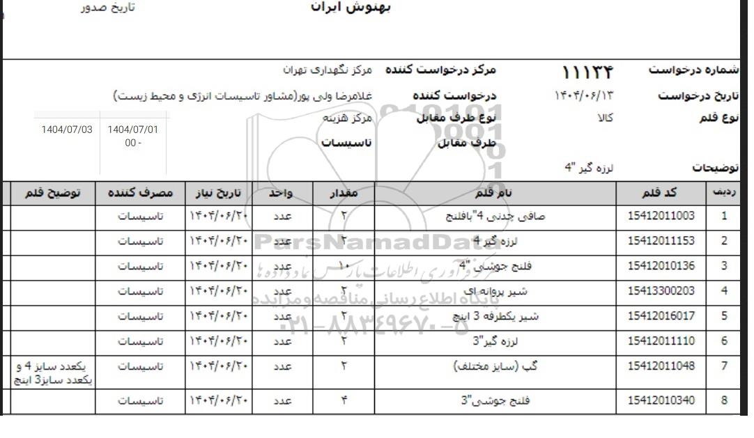 | 8 | 15412010340 | فلنج جوشی 3 | 2 | عدد | 1404.6.20 | تاسیسات |