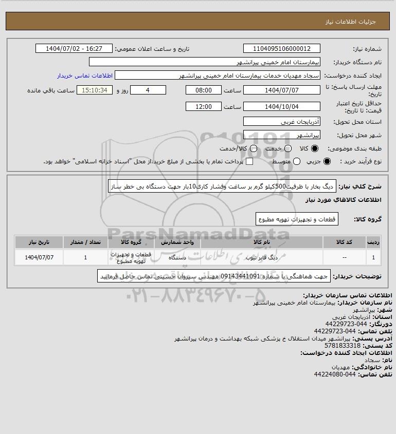 شرح کلی نیاز: دیگ بخار با ظرفیت500کیلو گرم بر ساغت وفشار کاری10بار جهت دستگاه بی خطر ساز