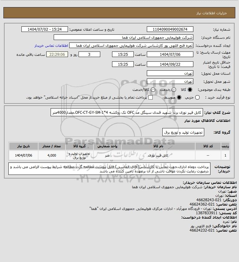 1 -- کابل فیبر نوری متر تجهیزات تولید و توزیع برق 4,000 1404/07/06