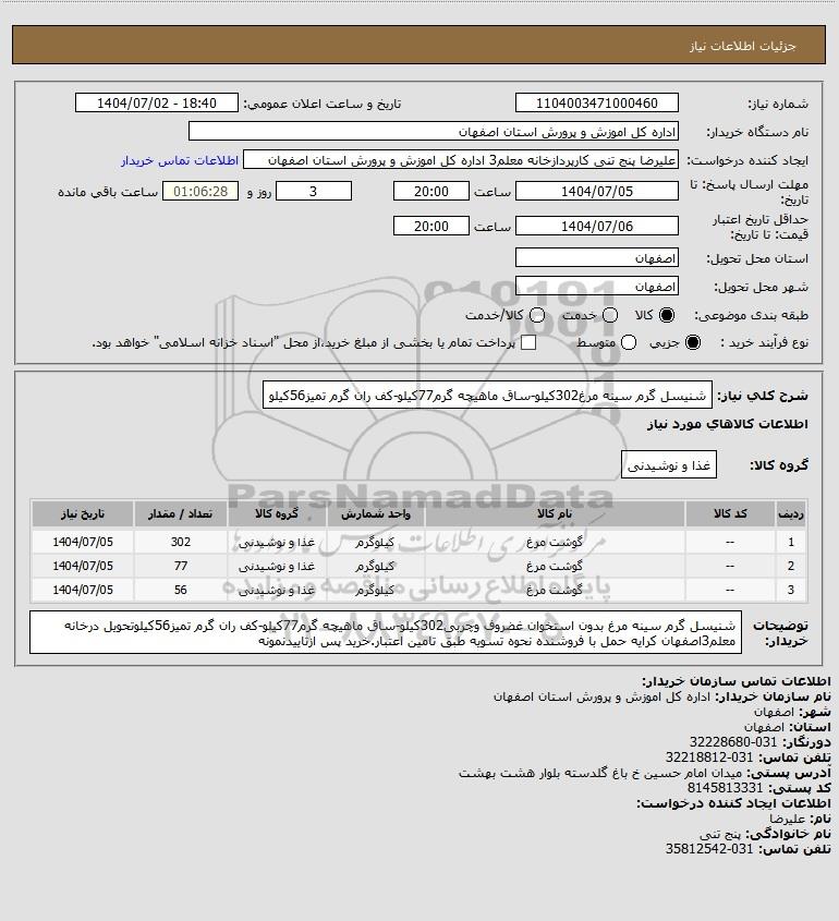 شرح کلی نیاز: شنیسل گرم سینه مرغ302کیلو-ساق ماهیچه گرم77کیلو-کف ران گرم تمیز56کیلو