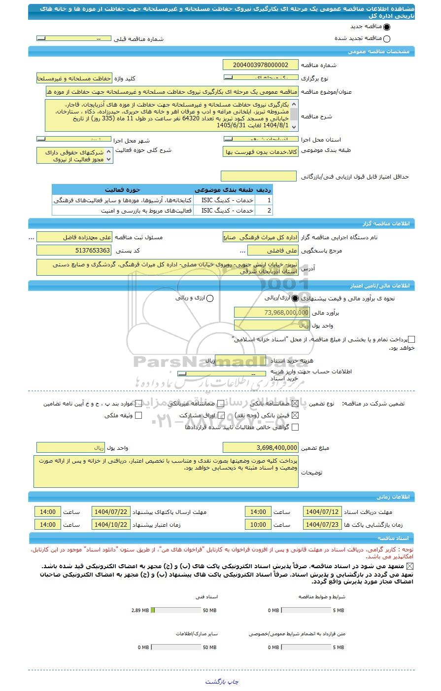 | عنوان/موضوع مناقصه | مناقصه عمومی یک مرحله ای بکارگیری نیروی حفاظت مسلحانه و غیرمسلحانه جهت حفاظت از موزه ها و خانه های تاریخی اداره کل | |||||||||||