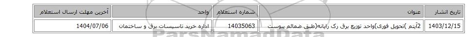 | 1403/12/15 | 2آیتم )تحویل فوری)واحد توزیع برق رک رایانه(طبق ضمائم پیوست | 14035063 | اداره خرید تاسیسات برق و ساختمان | 1404/07/06 |