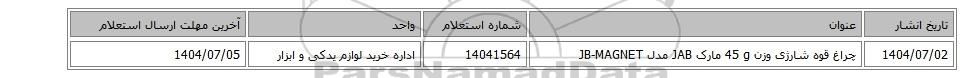 | 1404/07/02 | چراغ قوه شارژی وزن 45 g مارک JAB مدل JB-MAGNET | 14041564 | اداره خرید لوازم یدکی و ابزار | 1404/07/05 |