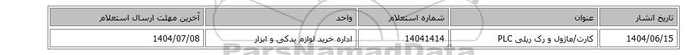 | 1404/06/15 | کارت/ماژول و رک ریلی PLC | 14041414 | اداره خرید لوازم یدکی و ابزار | 1404/07/08 |