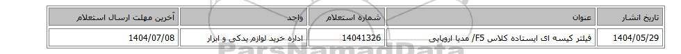 | 1404/05/29 | فیلتر کیسه ای ایستاده کلاس F5/ مدیا اروپایی | 14041326 | اداره خرید لوازم یدکی و ابزار | 1404/07/08 |