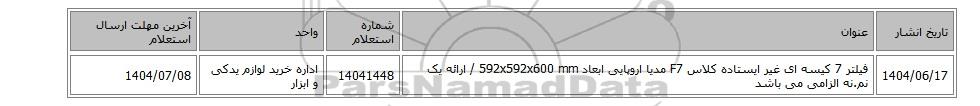 | 1404/06/17 | فیلتر 7 کیسه ای غیر ایستاده کلاس F7 مدیا اروپایی ابعاد 592x592x600 mm / ارائه یک نم.نه الزامی می باشد | 14041448 | اداره خرید لوازم یدکی و ابزار | 1404/07/08 |
