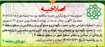 بدینوسیله تاریخ برگزاری جلسه مناقصه روز سه شنبه مورخ 1404.7.15 موضوع آگهی چاپ شده در روزنامه همشهری مورخ 31 شهریور (ردیف 4 عملیات طراحی ، چاپ ، نصب ، نگهداری و جمع آوری بنر و فلکسی در سطح منطقه 2 ردیف 5 نصب نگهداری پرچمهای پایه کوتاه و بلند آذین بندی مناسبتی با ریسه های پارچه ای در میادین و معابر سطح شهر در سطح منطقه 2)
