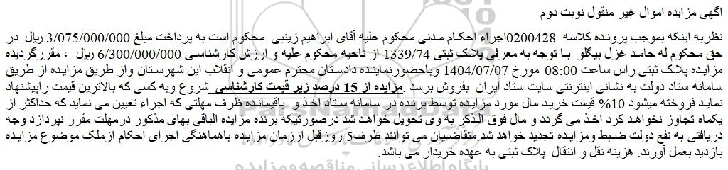 نظربه اینکه بموجب پرونده کلاسه 0200428اجراء احکام مدنی محکوم علیه آقای ابراهیم زینبی محکوم است به پرداخت مبلغ 3/075/000/000 ریال در حق محکوم له حامد غزل بیگلو با توجه به معرفی پلاک ثبتی 1339/74 از ناحیه محکوم علیه و ارزش کارشناسی 6/300/000/000 ریال ، مقررگردیده مزایده پلاک ثبتی راس ساعت 08:00 مورخ 1404/07/07 وباحضورنماینده دادستان محترم عمومی و انقلاب این شهرستان واز طریق مزایده از طریق سامانه ستاد دولت به نشانی اینترنتی سایت ستاد ایران بفروش برسد .مزایده از 15 درصد زیر قیمت کارشناسی شروع وبه کسی که بالاترین قیمت راپیشنهاد نماید فروخته میشود 10% قیمت خرید مال مورد مزایده توسط برنده در سامانه ستاد اخذ و باقیمانده ظرف مهلتی که اجراء تعیین می نماید که حداکثر از یکماه تجاوز نخواهد کرد اخذ می گردد و مال فوق الذکر به وی تحویل خواهد شد درصورتیکه برنده مزایده الباقی بهای مذکور درمهلت مقرر نپردازد وجه دریافتی به نفع دولت ضبط ومزایده تجدید خواهد شد.متقاضیان می توانند ظرف5 روزقبل اززمان مزایده باهماهنگی اجرای احکام ازملک موضوع مزایده بازدید بعمل آورند. هزینه نقل و انتقال پلاک ثبتی به عهده خریدار می باشد.