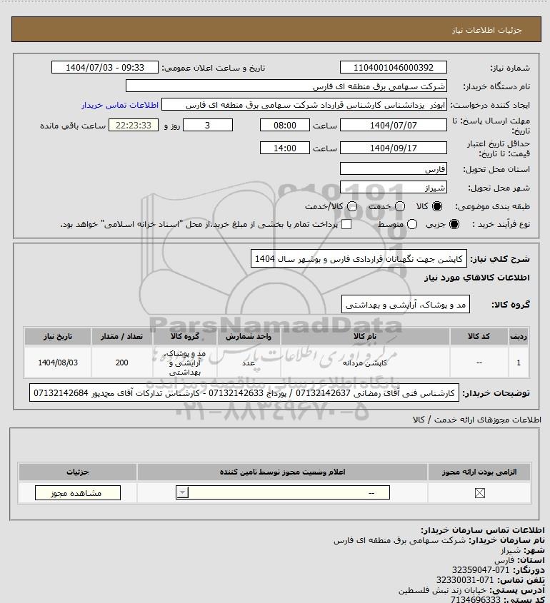 شرح کلی نیاز: کاپشن جهت نگهبانان قراردادی فارس و بوشهر سال 1404