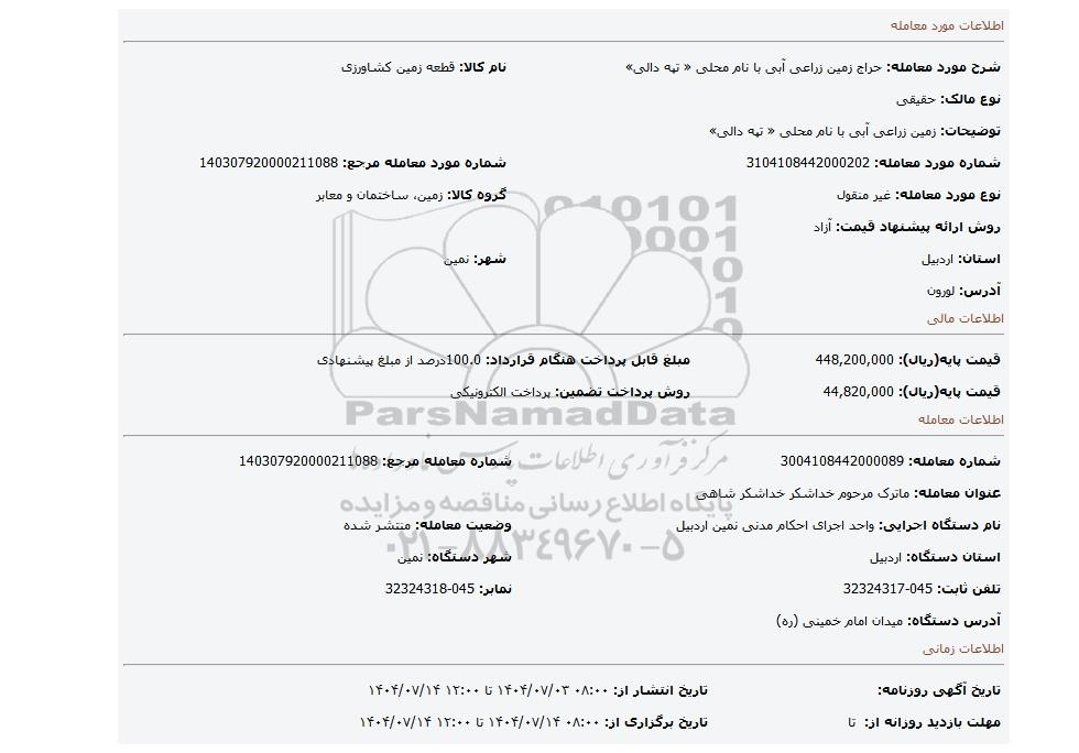 مزایده عمومی مزایده زمین زراعی آبی با نام محلی « تپه دالی» برگزار میگردد. از کلیه افراد متخصص و شرکتهای واجد شرایط دعوت به عمل میآید تا در این مزایده با کد خبرگزاری پارس نماد : 9598496 شرکت نمایند تاریخ شروع مزایده : 1404/07/03 مهلت شرکت در مزایده: تا پایان روز 1404/07/14 مکان برگزاری اموال واگذاری استانهای اردبیل و دستهبندیهای مربوط به این حراجی ماشین آلات و تجهیزات کشاورزی و دام پروری, املاک و زمین میباشد.