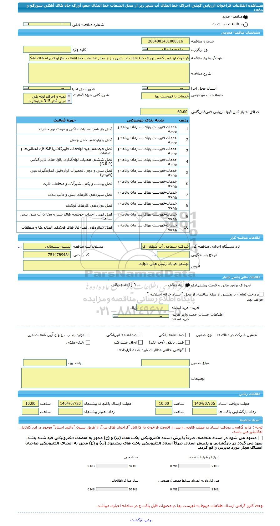 | شماره مناقصه | 2004001431000016 | |||||||||||||||||||||||||||||||||||