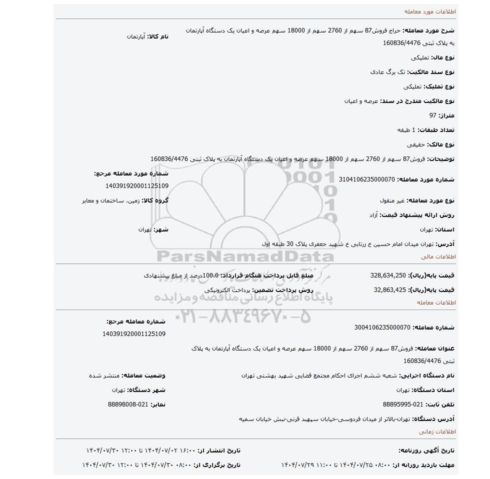 | شرح مورد معامله: حراج فروش87 سهم از 2760 سهم از 18000 سهم عرصه و اعیان یک دستگاه آپارتمان به پلاک ثبتی 160836/4476 | نام کالا: آپارتمان | |