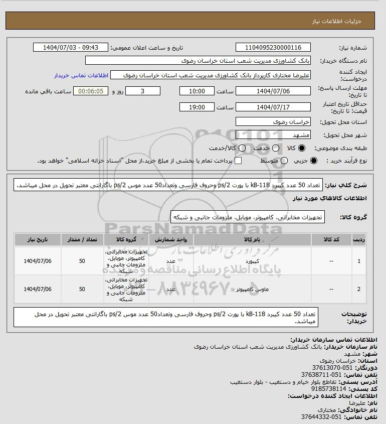 | 1 | -- | کیبورد | عدد | تجهیزات مخابراتی، کامپیوتر، موبایل، ملزومات جانبی و شبکه | 50 | 1404/07/06 |