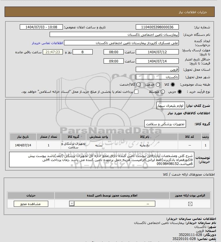 نام دستگاه خریدار:بیمارستان تامین اجتماعی تاکستان