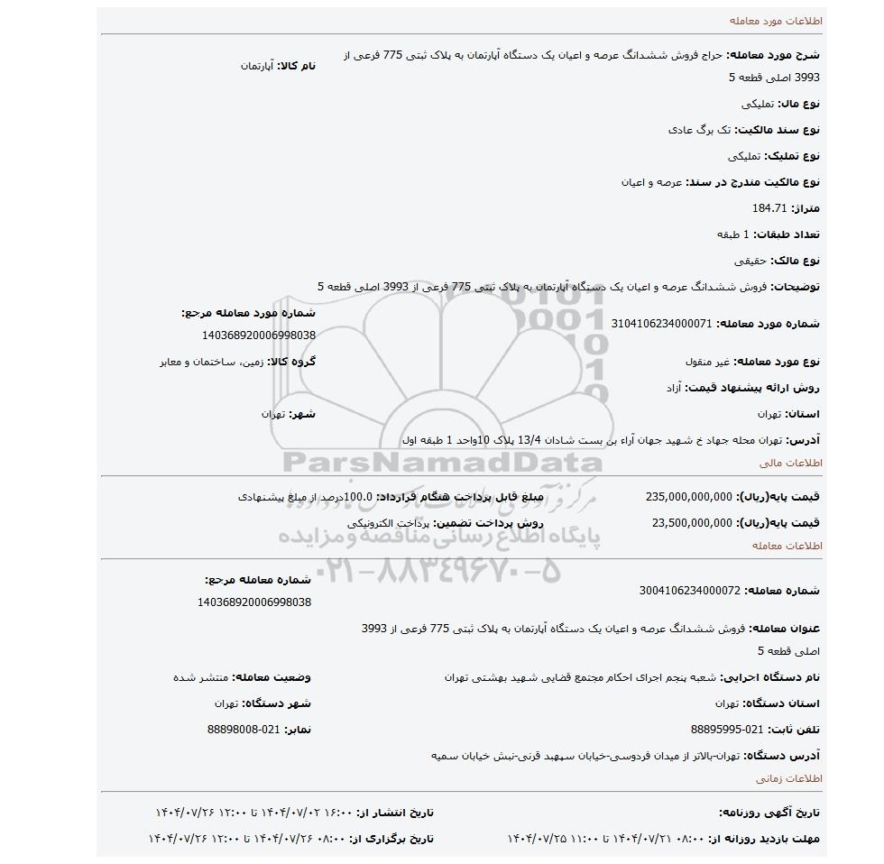 | شرح مورد معامله: حراج فروش ششدانگ عرصه و اعیان یک دستگاه آپارتمان به پلاک ثبتی 775 فرعی از 3993 اصلی قطعه 5 | نام کالا: آپارتمان | |