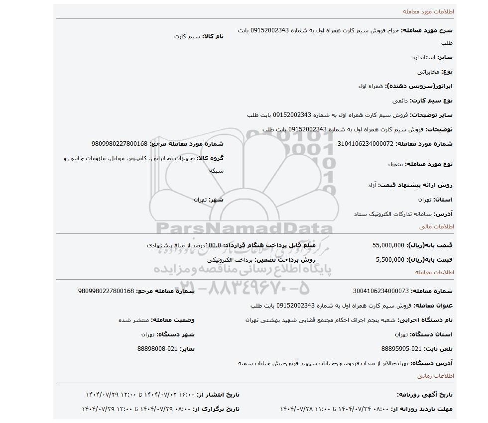 | عنوان معامله: فروش سیم کارت همراه اول به شماره 09152002343 بابت طلب | ||