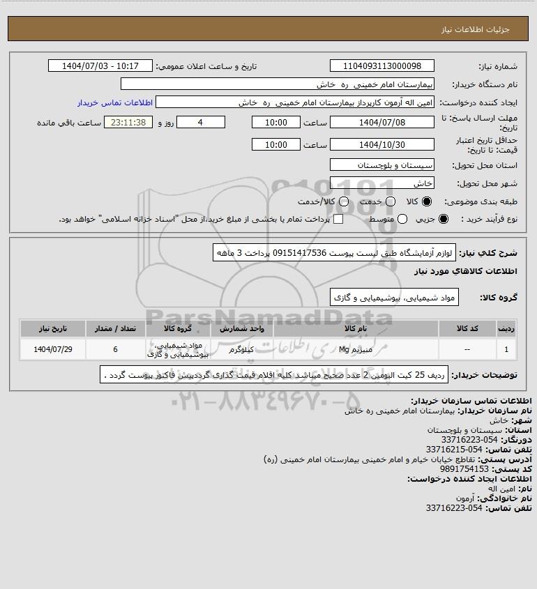 استعلام بها و موضوع استعلام استعلام لوازم آزمایشگاه طبق لیست پیوست 09151417536 پرداخت 3 ماهه به اطلاع کلیه شرکتها و افراد متخصص واجد شرایط میرساند، آگهی گذار در نظر دارد از طریق استعلام بها، نسبت به انتخاب و دریافت پیشنهادات اقدام نماید. این استعلام با کد آگهی ثبت شده در سامانه خبرگزاری پارس نماد : 9599203 منتشر شده است. مشخصات استعلام : تاریخ شروع استعلام: 1404/07/03 آخرین مهلت ارسال پیشنهاد قیمت : 1404/07/08 و محل اجرای پروژه : استان سیستان و بلوچستان میباشد. استعلام قیمت مورد درخواست : استعلام لوازم آزمایشگاه طبق لیست پیوست 09151417536 پرداخت 3 ماهه با دستهبندیهای تخصصی و گروه های مرتبط : خدمات و تجهیزات آزمایشگاهی و پزشکی, مواد شیمیایی, مواد اولیه کارخانجات, استعلام اطلاع رسانی میگردد.