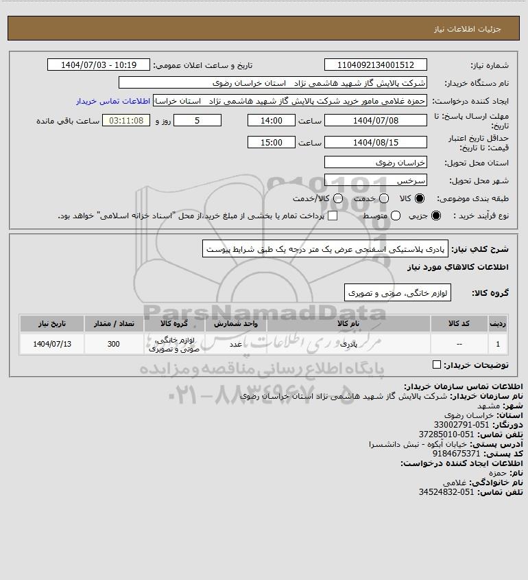 نام دستگاه خریدار:شرکت پالایش گاز شهید هاشمی نژاد استان خراسان رضوی