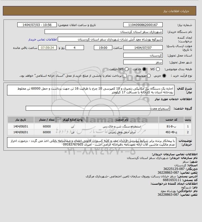 شرح کلی نیاز: اجاره یک دستگاه بیل مکانیکی زنجیری و 10 کمپرسی 10 چرخ با ظرفیت 16 تن جهت برداشت و حمل 60000 تن مخلوط رودخانه آدینان به کارخانه با مسافت 17 کیلومتر