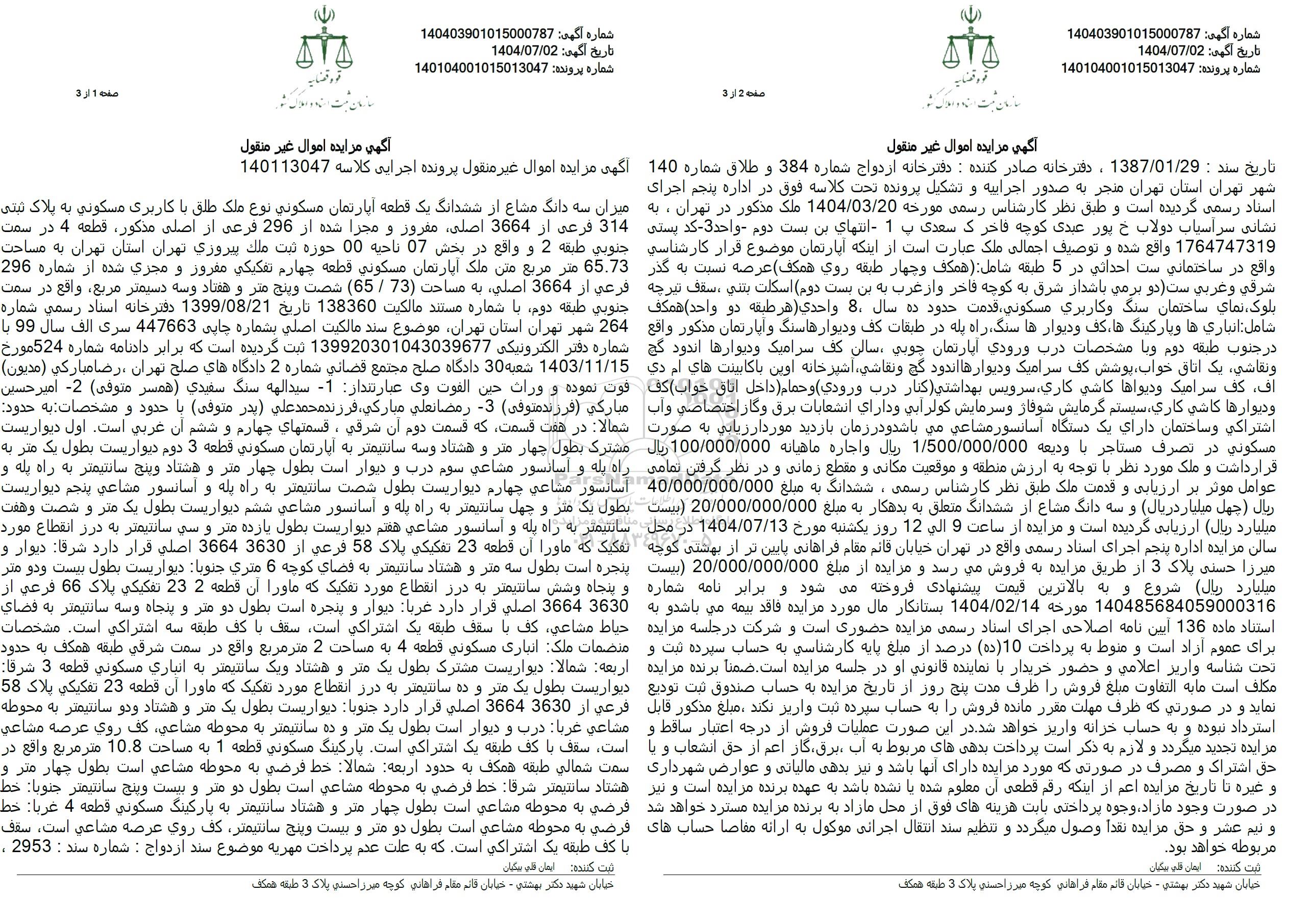 تاریخ مزایده از ساعت 9 الی 12 روز یکشنبه مورخ 1404.7.13 در محل سالن مزایده اداره پنجم اجرای اسناد رسمی واقع در تهران خیابان قائم مقام فراهانی پایین تر از بهشتی کوچه میرزا حسنی پلاک 3