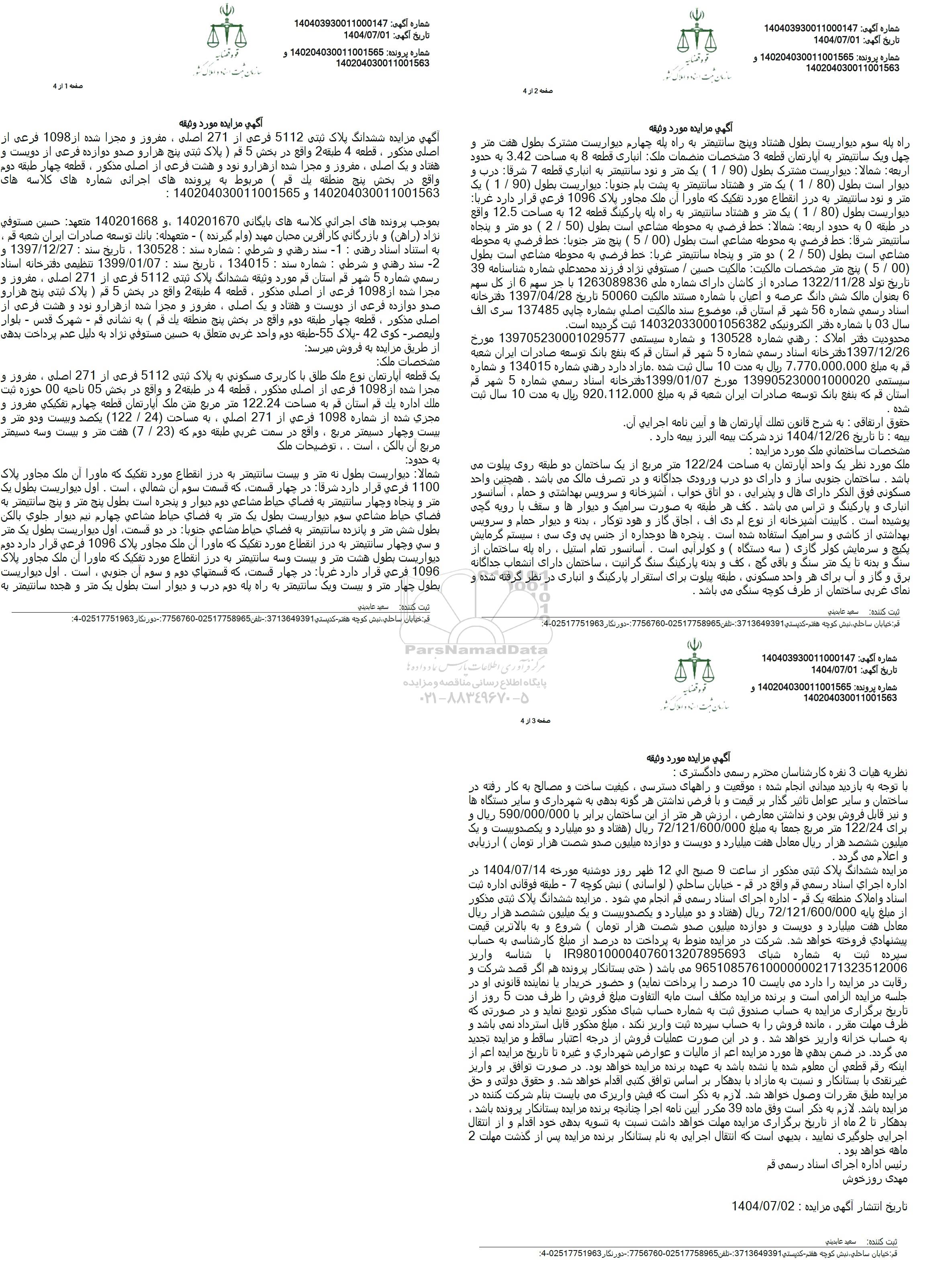 مزایده ششدانگ پلاک ثبتی 5112 فرعی از 271 اصلی، مفروز و مجزا شده از 1098 فرعی از اصلی مذکور، قطعه 4 طبقه 2