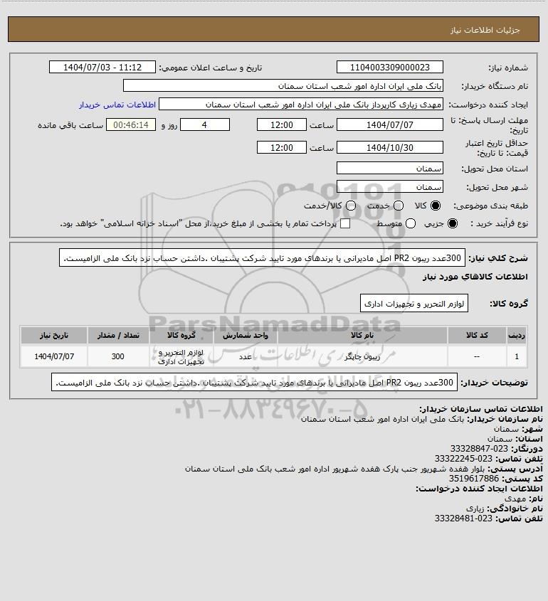 شرح کلی نیاز: 300عدد ریبون PR2 اصل مادیرانی یا برندهای مورد تایید شرکت پشتیبان .داشتن حساب نزد بانک ملی الزامیست.