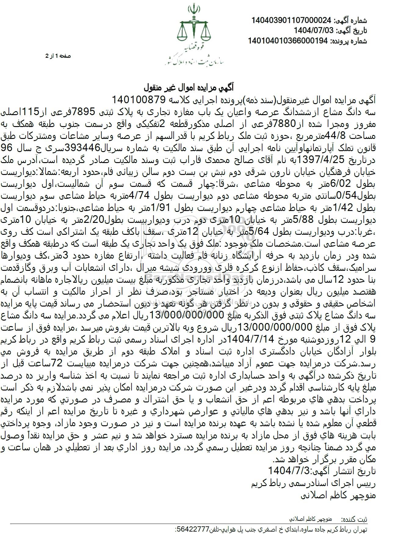 آگهی مزایده اموال غیر منقول سند دمه پرونده اجرایی کلاسه 140100879 سه دانگ مشاع از ششدانگ عرصه و اعیان یک باب مغازه تجاری به پلاک ثبتی 7895 فرعی از 115 اصلی مفروز و مجزا شده از 7880 فرعی از اصلی مذکور قطعه 2 تفکیکی واقع در سمت جنوب طبقه همکف به مساحت 44/8 متر مربع ، حوزه ثبت ملک رباط کریم با قدر السهم از عرصه و سایر مشاعات ومشترکات طبق قانون تملک آپارتمانها و آیین نامه اجرایی آن طبق سند مالکیت به شماره سریال 393446 سری ج سال 96 در تاریخ 1397/4/25 به نام آقای صالح محمدی فاراب ثبت و سند مالکیت صادر گردیده است، آدرس ملک خیابان فرهنگیان خیابان نارون شرقی دوم نبش بن بست دوم سالن زیبائی فام حدود اربعه شمالا دیواریست بطول 6/02 متر به محوطه مشاعی ، شرقا چهار قسمت که قسمت سوم آن شمالیست اول دیواریست بطول 0/54 سانتی متر به محوطه مشاعی دوم دیواریست بطول 4/74 متر به حیاط مشاعی سوم دیواریست بطول 1/42 متر به حیاط مشاعی چهارم دیواریست بطول 1/91 متر به حیاط مشاعی جنوبا در دو قسمت اول دیواریست بطول 5/88 متر به خیابان 10 متری دوم درب و دیوار بیست بطول 2/20 متر به خیابان 10 متری غربا درب و دیواریست بطول 5/64 متر به خیابان 12 متری ، سقف باکف طبقه یک اشتراکی است کف روی عرصه مشاعی است. مشخصات ملک موجود ملک فوق یک واحد تجاری یک طبقه است که در طبقه همکف واقع شده و در زمان بازدید به حرفه آرایشگاه زنانه فام فعالیت داشته ، ارتفاع مغازه حدود 3 متر ، کف و دیوارها سرامیک سقف کاذب حفاظ از نوع کرکره فلزی و ورودی شیشه میرال دارای انشعابات آب و برق و گاز قدمت بنا حدود 12 سال می باشد در زمان بازدید واحد تجاری مذکور به مبلغ بیست میلیون ریالاجاره ماهانه بانضمام هفتصد میلیون ریال بعنوان ودیعه در اختیار مستاجر بود، صرف نظر از احراز مالکیت و انتساب آن به اشخاص حقیقی و حقوقی و بدون در نظر گرفتن هر گونه تعهد و دیون استحضار میرساند قیمت پایه مزایده سه دانگ مشاع پلاک ثبتی فوق الذکر به مبلغ 13.000.000.000 ریال اعلام می گردد. مزایده سه دانگ مشاع پلاک فوق از مبلغ 13.000.000.000 ریال شروع و به بالاترین قیمت بفروش میرسد ، مزایده فوق از ساعت و الی 12 روز دوشنبه مورخ 1404.7.14 در اداره اجرای اسناد رسمی ثبت رباط کریم واقع در رباط کریم بلوار آزادگان خیابان دادگستری اداره ثبت اسناد و املاک طبقه دوم از طریق مزایده به فروش می رسد شرکت در مزایده جهت عموم آزاد میباشد همچنین جهت شرکت در مزایده میبایست 72 ساعت قبل از تاریخ ذکر شده در آگهی به واحد حسابداری اداره ثبت مراجعه نمایند تا نسبت به اخذ شناسه واریز ده درصد مبلغ پایه کارشناسی اقدام گردد و در غیر این صورت شرکت در مزایده امکان پذیر نمی باشد لازم به ذکر است پرداخت بدهی های مربوطه اعم از حق انشعاب و یا حق اشتراک و مصرف در صورتی که مورد مزایده دارای آنها باشد و نیز بدهی های مالیاتی و عوارض شهرداری و غیره تا تاریخ مزایده اعم از اینکه رقم قطعی أن معلوم شده یا نشده باشد به عهده برنده مزایده است و نیز در صورت وجود مازاد، وجوه پرداختی بابت هزینه های فوق از محل مازاد به برنده مزایده مسترد خواهد شد و نیم عشر و حق مزایده نقداً وصول می گردد ضمنا چنانچه روز مزایده تعطیل رسمی گردد مزایده روز اداری بعد از تعطیلی در همان ساعت و مکان مقرر برگزار خواهد شد.