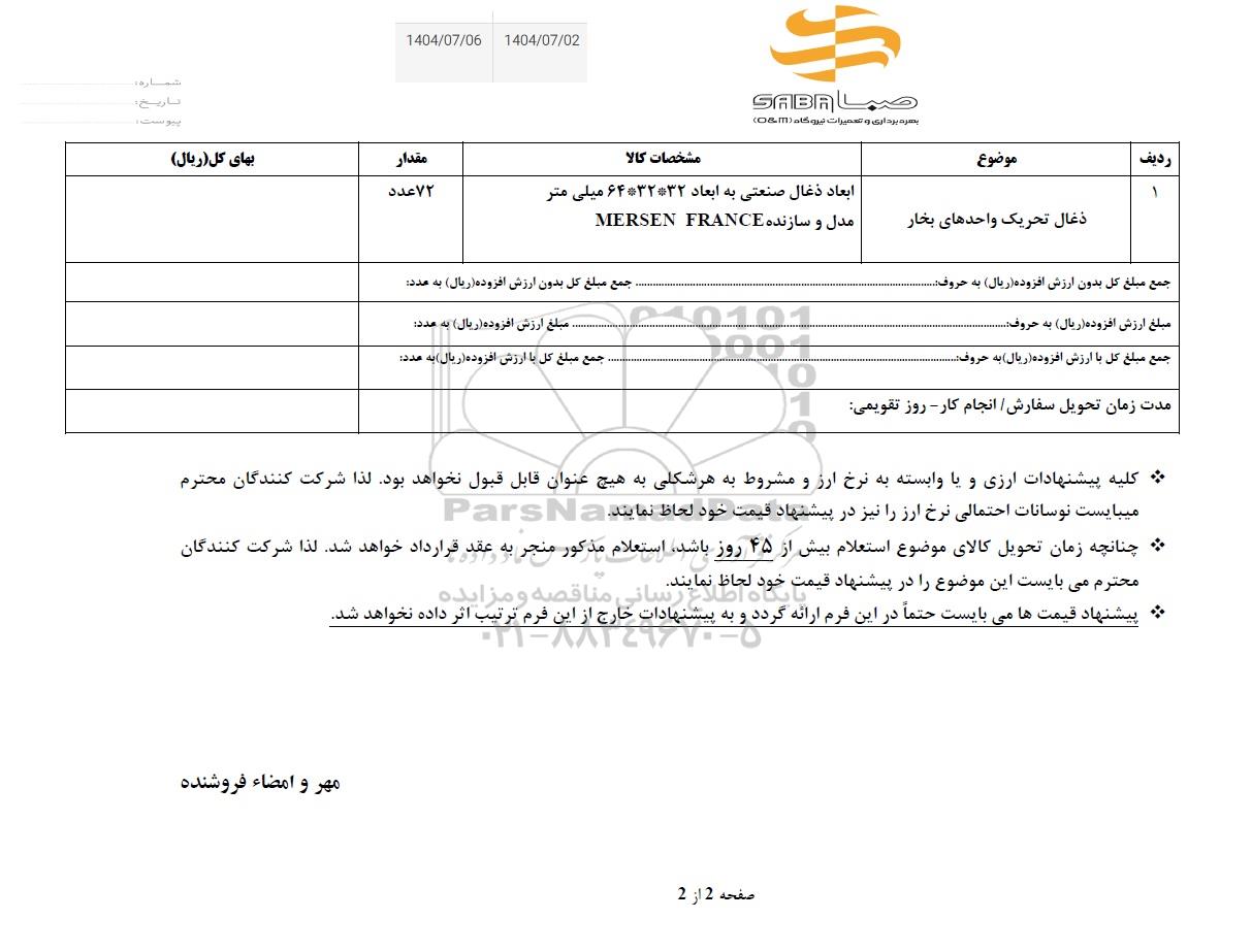 | 1 | ذغال تحریک واحدهای بخار | ابعاد ذغال صنعتی به ابعاد 32*32*64 میلی متر MERSEN FRANCE | 72 عدد |