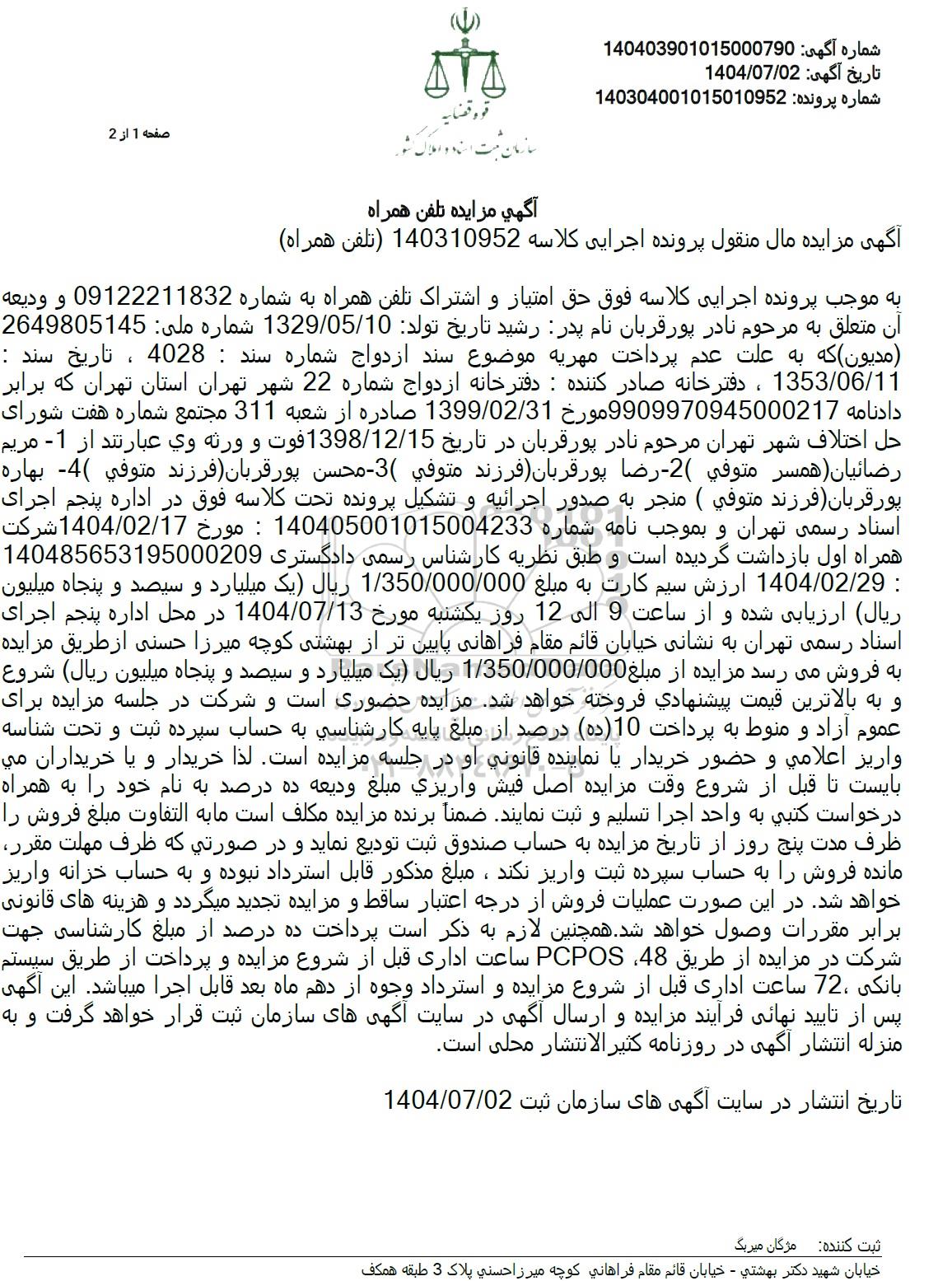 به موجب پرونده اجرایی کلاسه فوق حق امتیاز و اشتراک تلفن همراه به شماره 09122211832 و ودیعه آن متعلق به مرحوم نادر پورقربان نام پدر رشید تاریخ تولد: 1329.05.10 شماره ملی : 2649805145 (مدیون) که به علت عدم پرداخت مهریه موضوع سند ازدواج شماره سند : 4028 ، تاریخ سند : 1353.06.11 ، دفترخانه صادر کننده : دفترخانه ازدواج شماره 22 شهر تهران استان تهران که برابر دادنامه 9909970945000217 مورخ 1399.02.31 صادره از شعبه 311 مجتمع شماره هفت شورای حل اختلاف شهر تهران مرحوم نادر پورقربان در تاریخ 1398.12.15 فوت و ورثه وي عبارتند از 1 مريم رضائیان همسر متوفي -2- رضا پور قربان فرزند متوفي - 3 - محسن پورقربان فرزند) متوفي 4- بهاره پورقربان (فرزند متوفي ) منجر به صدور اجرائیه و تشکیل پرونده تحت کلاسه فوق در اداره پنجم اجرای اسناد رسمی تهران و بموجب نامه شماره 140405001015004233 : مورخ 1404.02.17 شرکت همراه اول بازداشت گردیده است و طبق نظریه کارشناس رسمی دادگستری 140485653195000209 : 1404.02.29 ارزش سیم کارت به مبلغ 1.350.000.000 ریال یک میلیارد و سیصد و پنجاه میلیون ریال ارزیابی شده و از ساعت 9 الی 12 روز یکشنبه مورخ 1404.07.13 در محل اداره پنجم اجرای اسناد رسمی تهران به نشانی خیابان قائم مقام فراهانی پایین تر از بهشتی کوچه میرزا حسنی از طریق مزایده به فروش می رسد مزایده از مبلغ 1.350.000.000 ریال یک میلیارد و سیصد و پنجاه میلیون ریال شروع و به بالاترین قیمت پیشنهادی فروخته خواهد شد مزایده حضوری است و شرکت در جلسه مزایده برای عموم آزاد و منوط به پرداخت (10 ده درصد از مبلغ پایه کارشناسی به حساب سپرده ثبت و تحت شناسه واریز اعلامی و حضور خریدار یا نماینده قانونی او در جلسه مزایده است. لذا خریدار و یا خریداران مي بایست تا قبل از شروع وقت مزایده اصل فیش واريزي مبلغ ودیعه ده درصد به نام خود را به همراه درخواست کتبی به واحد اجرا تسلیم و ثبت نمایند. ضمنا برنده مزایده مکلف است ما به التفاوت مبلغ فروش را ظرف مدت پنج روز از تاریخ مزایده به حساب صندوق ثبت تودیع نماید و در صورتی که ظرف مهلت مقرر مانده فروش را به حساب سپرده ثبت واریز نکند، مبلغ مذکور قابل استرداد نبوده و به حساب خزانه واریز خواهد شد. در این صورت عملیات فروش از درجه اعتبار ساقط و مزایده تجدید میگردد و هزینه های قانونی برابر مقررات وصول خواهد شد. همچنین لازم به ذکر است پرداخت ده درصد از مبلغ کارشناسی جهت شرکت در مزایده از طریق 48 PCPOS ساعت اداری قبل از شروع مزایده و پرداخت از طریق سیستم بانکی 72 ساعت اداری قبل از شروع مزایده و استرداد وجوه از دهم ماه بعد قابل اجرا میباشد. این آگهی پس از تایید نهایی فرآیند مزایده و ارسال آگهی در سایت آگهی های سازمان ثبت قرار خواهد گرفت و به منزله انتشار آگهی در روزنامه کثیر الانتشار محلی است.
