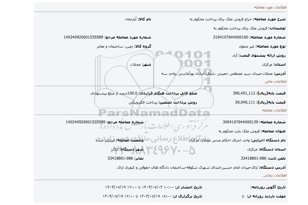 نام دستگاه اجرایی: واحد اجرای احکام مدنی محلات مرکزیوضعیت معامله: منتشر شده