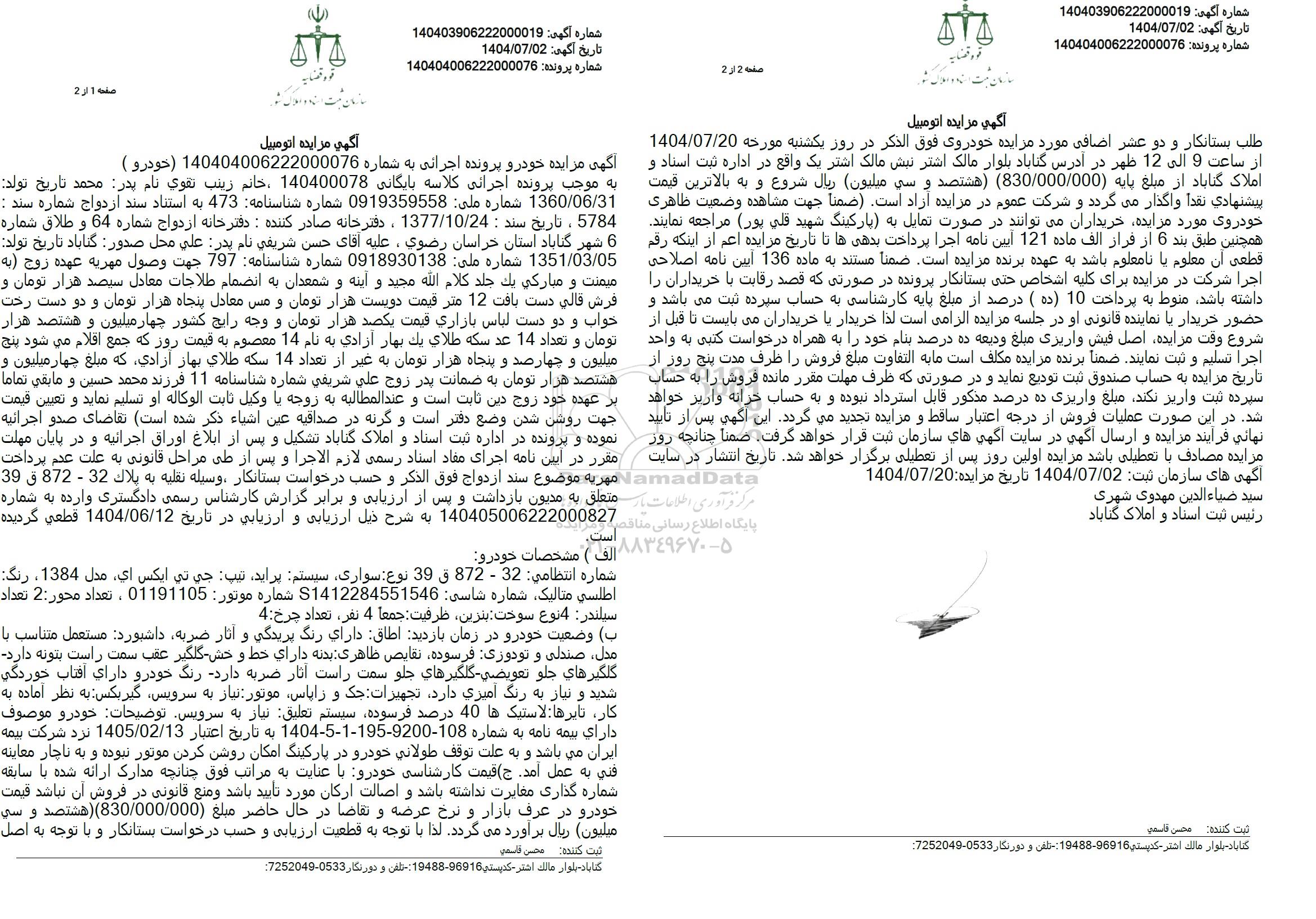 ب) وضعیت خودرو در زمان بازدید اطاق دارای رنگ پریدگی و آثار ضربه داشبورد مستعمل متناسب با مدل صندلی و تودوزی فرسوده نقایص ظاهری بدنه دارای خط و خش گلگیر عقب سمت راست بتونه دارد گلگیرهای جلو تعویضی - گلگیرهای جلو سمت راست آثار ضربه دارد رنگ خودرو دارای افتاب خوردگی شدید و نیاز به رنگ امیزی دارد تجهیزات جک و رایاس موتور نیاز به سرویس گیربکس به نظر آماده به کار تایرها لاستیک ها 40 درصد فرسوده سیستم تعلیق نیاز به سرویس توضیحات خودرو موصوف دارای بیمه نامه به شماره 108-9200-195-1-5-1404 به تاریخ اعتبار 1405.02.13 نزد شرکت بیمه ایران می باشد و به علت توقف طولانی خودرو در پارکینگ امکان روشن کردن موتور نبوده و به ناچار معاینه فنی به عمل آمد. (ج) قیمت کارشناسی خودرو با عنایت به مراتب فوق چنانچه مدارک ارائه شده با سابقه شماره گذاری مغایرت نداشته باشد و اصالت ارکان مورد تایید باشد و منع قانونی در فروش آن نباشد قیمت خودرو در عرف بازار و نرخ عرضه و تقاضا در حال حاضر مبلغ (830.000.000) (هشتصد و سی (میلیون ریال برآورد میگردد. لذا با توجه به قطعیت ارزیابی و حسب درخواست بستانکار و با توجه به اصل طلب بستانکار و دو عشر اضافی مورد مزایده خودروی فوق الذکر در روز یکشنبه مورخه 1404.07.20 از ساعت 9 الی 12 ظهر در آدرس گناباد بلوار مالک اشتر نیش مالک اشتر یک واقع در اداره ثبت اسناد و املاک گناباد از مبلغ پایه (830.000.000) (هشتصد و سی میلیون) ریال شروع و به بالاترین قیمت پیشنهادی نقدا واگذار می گردد و شرکت عموم در مزایده آزاد است. ضمنا جهت مشاهده وضعیت ظاهری خودروی مورد مزایده خریداران میتوانند در صورت تمایل به پارکینگ شهید قلی پور) مراجعه نمایند. همچنین طبق بند 6 از فراز الف ماده 121 آیین نامه اجرا پرداخت بدهی ها تا تاریخ مزایده اعم از اینکه رقم قطعی آن معلوم با نا معلوم باشد به عهده برنده مزایده است. ضمناً مستند به ماده 136 آیین نامه اصلاحی اجرا شرکت در مزایده برای کلیه اشخاص حتی بستانکار پرونده در صورتی که قصد رقابت با خریداران را داشته باشد منوط به پرداخت 10 (ده) درصد از مبلغ پایه کارشناسی به حساب سپرده ثبت می باشد و حضور خریدار با نماینده قانونی او در جلسه مزایده الزامی است لذا خریدار با خریداران می بایست تا قبل از شروع وقت مزایده اصل فیش واریزی مبلغ ودیعه ده درصد بنام خود را به همراه درخواست کتبی به واحد اجرا تسلیم و ثبت نمایند. ضمناً برنده مزایده مکلف است ما به التفاوت مبلغ فروش را ظرف مدت پنج روز از تاریخ مزایده به حساب صندوق ثبت تودیع نماید و در صورتی که ظرف مهلت مقرر مانده فروش را به حساب سپرده ثبت واریز نکند مبلغ واریزی ده درصد مذکور قابل استرداد نبوده و به حساب خزانه واریز خواهد شد. در این صورت عملیات فروش از درجه اعتبار ساقط و مزایده تجدید می گردد. این آگهی پس از تایید نهایی فرایند مزایده و ارسال آگهی در سایت آگهی های سازمان ثبت قرار خواهد گرفت. ضمنا چنانچه روز مزایده مصادف با تعطیلی باشد مزایده اولین روز پس از تعطیلی برگزار خواهد شد.