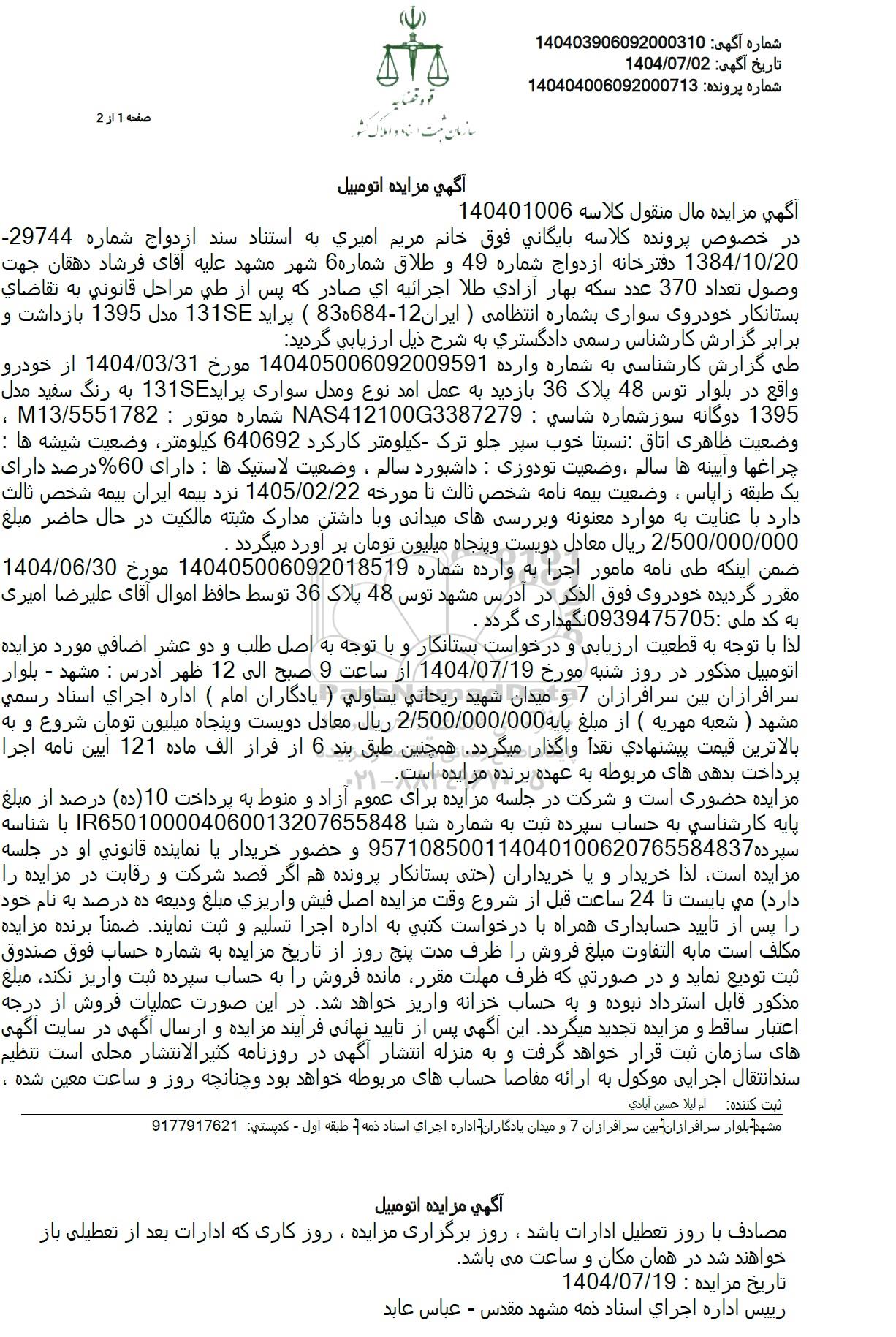 لذا با توجه به قطعیت ارزیابی و درخواست بستانکار و با توجه به اصل طلب و دو عشر اضافی مورد مزایده اتومبیل مذکور در روز شنبه مورخ 1404.07.19 از ساعت 9 صبح الى 12 ظهر آدرس : مشهد - بلوار سرافرازان بین سرافرازان 7 و میدان شهید ریحانی یساولی یادگاران امام اداره اجرای اسناد رسمی مشهد شعبه مهریه از مبلغ پایه 2.500.000.000 ریال معادل دویست و پنجاه میلیون تومان شروع و به بالاترین قیمت پیشنهادی نقدا واگذار میگردد همچنین طبق بند 6 از فراز الف ماده 121 آیین نامه اجرا پرداخت بدهی های مربوطه به عهده برنده مزایده است.