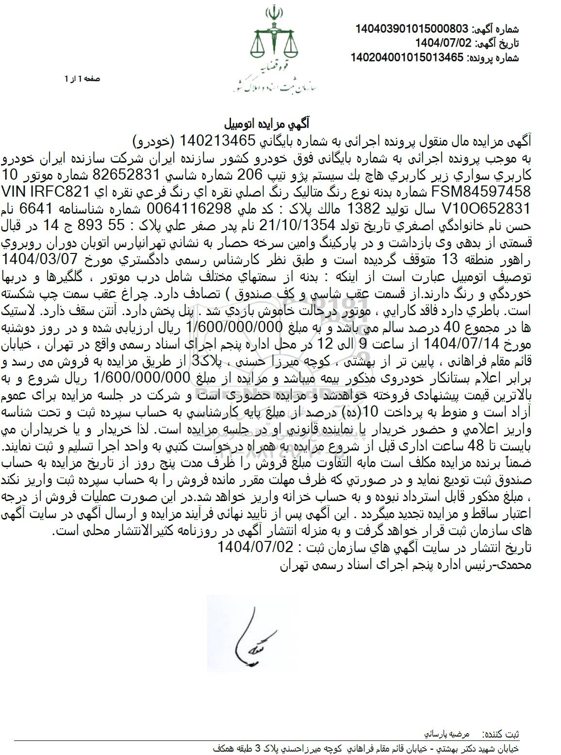 آگهی مزایده مال منقول پرونده اجرائی به شماره بایگانی 140213465 (خودرو)
