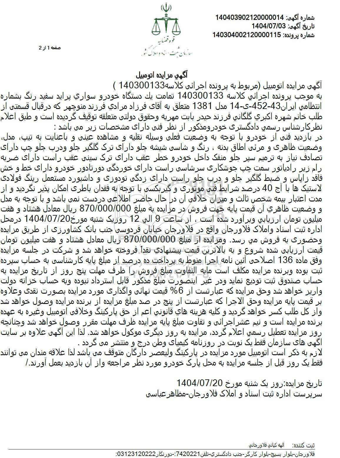 در بازدید فنی از خودرو با توجه به وضعیت فعلی وسیله نقلیه و مشاهده عینی و با عنایت به تیپ مدل وضعیت ظاهری و مرئی اطاق بدنه ، رنگ و شاسی شیشه جلو دارای ترک گلگیر جلو و درب جلو چپ دارای تصادف نیاز به ترمیم سپر جلو منفک داخل خودرو خطر عقب دارای ترک سینی عقب راست دارای ضربه رام زیر رادیاتور سمت چپ جوشکاری سرشاسی راست دارای خوردگی دور تا دور خودرو دارای خط و خش فاقد زاپاس و ضبط گلگیر جلو و درب جلو راست دارای زدگی تودوزی و داشبورد مستعمل رینگ فولادی لاستیک ها با آج 40 درصد شرایط فنی موتوری و گیربکسی با توجه به فقدان باطری امکان پذیر نگردید و از مدت اعتبار بیمه شخص ثالث و میزان خلافی آن در حال حاضر اطلاعی در دست نمی باشد و با توجه به مدل و وضعیت ظاهری آن قیمت پایه جهت فروش در مزایده به مبلغ 870.000.000 ريال معادل هشتاد و هفت میلیون تومان ارزیابی و برآورد شده است، از ساعت 9 الی 12 روز یک شنبه مورخ 1404.07.20 در محل اداره ثبت اسناد و املاک فلاورجان واقع در فلاورجان خیابان فردوسی جنب بانک کشاورزی از طریق مزایده و حضوری به فروش می رسد و مزایده از مبلغ 870.000.000 ریال معادل هشتاد و هفت میلیون تومان قیمت ارزیابی شده شروع و به بالاترین قیمت پیشنهادی نقدا فروخته خواهد شد و شرکت در جلسه مزایده وفق ماده 136 اصلاحی آئین نامه اجرا منوط به پرداخت ده درصد از مبلغ پایه کارشناسی به حساب سپرده ثبت بوده و برنده مزایده مکلف است ما به التفاوت مبلغ فروش را ظرف مهلت پنج روز از تاریخ مزایده به حساب صندوق ثبت تودیع نماید و در غیر اینصورت مبلغ مذکور قابل استرداد نبوده و به حساب خزانه دولت واریز خواهد شد و حق مزایده که عبارتست از 6 قیمت نهائی واگذاری مورد مزایده بصورت نقدی و علاوه بر قیمت پایه مزایده و حق الاجرا که عبارتست از پنج در صد مبلغ مزایده از برنده مزایده وصول خواهد شد و از کل طلب کسر خواهد گردید و کلیه هزینه هاي قانوني اعم از حق پارکینگ و خلافی اتومبیل و غیره به عهده برنده مزایده است و نیم عشر اجرائی و تفاوت مبلغ پایه مزایده ظرف مهلت مقرر وصول خواهد شد و چنانچه روز مزایده تعطیل رسمی اعلام گردد مزایده به روز دیگری موکول خواهد شد لذا این آگهی علاوه بر سایت