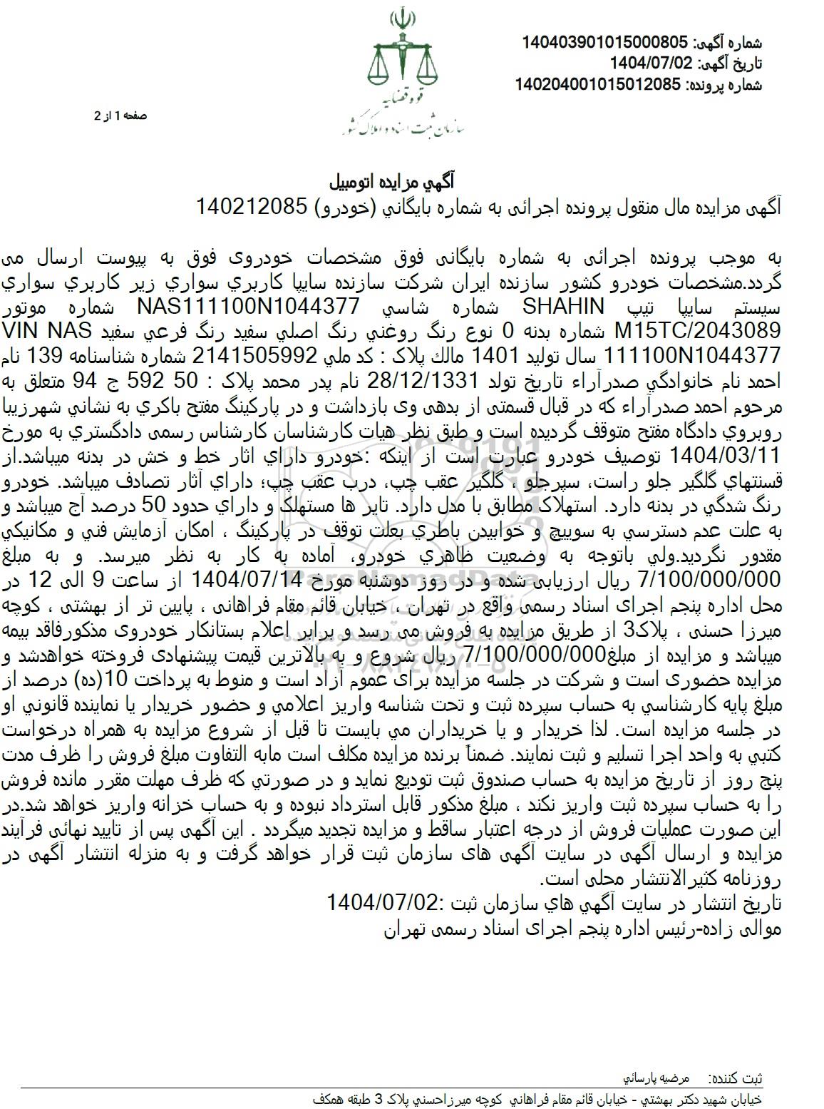 آگهی مزایده مال منقول پرونده اجرائی به شماره بایگانی (خودرو) 140212085