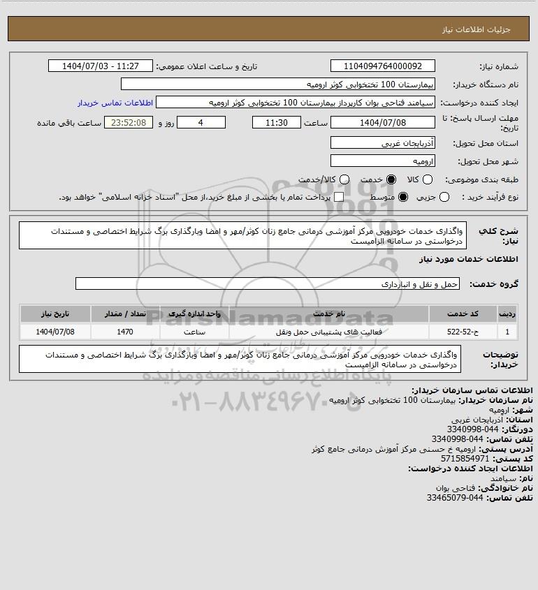 شرح کلی نیاز: واگذاری خدمات خودرویی مرکز آموزشی درمانی جامع زنان کوثر/مهر و امضا وبارگذاری برگ شرایط اختصاصی و مستندات درخواستی در سامانه الزامیست