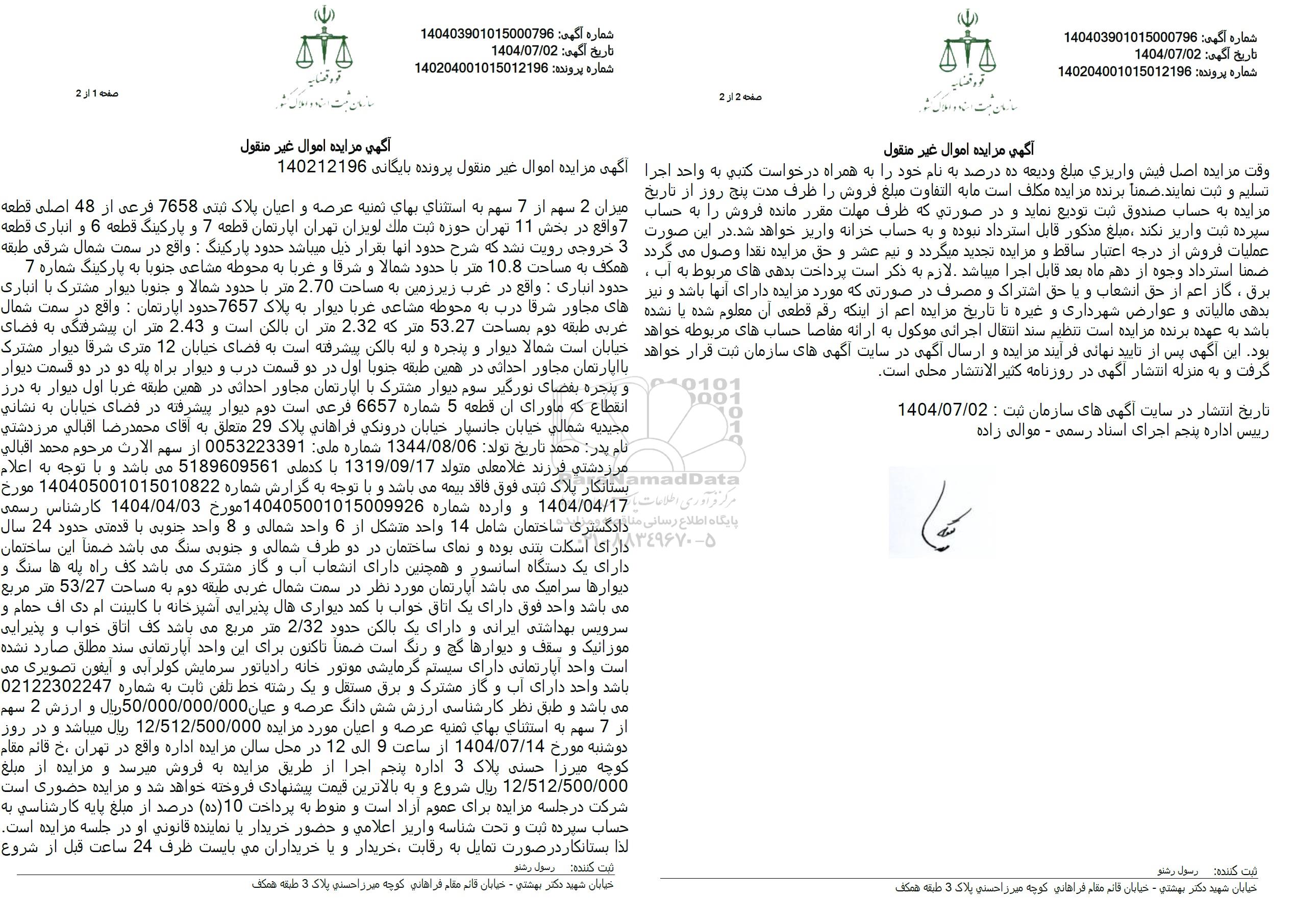 میزان 2 سهم از 7 سهم به استثنای بهای تمنیه عرصه و اعیان  پلاک ثبتی 7658 فرعی از 48 اصلی قطعه 7 واقع در بخش 11 تهران حوزه ثبت ملک لویران تهران آپارتمان قطعه 7 و پارکینگ قطعه 6 و انباری قطعه 3 خروجی رویت نشد که شرح حدود آنها بقرار ذیل میباشد حدود پارکینگ : واقع در سمت شمال شرقی طبقه همکف به مساحت 10.8 متر با حدود شمالا و شرقا و غربا به محوطه مشاعی جنوبا به پارکینگ شماره 7 حدود انباری واقع در غرب زیرزمین به مساحت 2.70 متر با حدود شمالا و جنوبا دیوار مشترک با انباری های مجاور شرقا درب به محوطه مشاعی غربا دیوار به پلاک 7657 حدود آپارتمان : واقع در سمت شمال غربی طبقه دوم بمساحت 53.27 متر که 2.32 متر آن بالکن است و 2.43 متر آن پیشرفتگی به فضای خیابان است شمالا دیوار و پنجره و لبه بالکن پیشرفته است به فضای خیابان 12 متری شرقا دیوار مشترک با اپارتمان مجاور احداثی در همین طبقه جنوبا اول در دو قسمت درب و دیوار براه پله دو در دو قسمت دیوار و پنجره بفضای نورگیر سوم دیوار مشترک با اپارتمان مجاور احداثی در همین طبقه عربا اول دیوار به درز انقطاع که ماورای آن قطعه 5 شماره 6657 فرعی است دوم دیوار پیشرفته در فضای خیابان به نشانی مجیدیه شمالی خیابان جانسپار خیابان درونکی فراهانی پلاک 29 متعلق به آقای محمدرضا اقبالی مرزدشتی نام پدر محمد تاریخ تولد : 1344.08.06 شماره ملی 0053223391 از سهم الارث مرحوم محمد اقبالی مرزدشتی فرزند غلامعلی متولد 1319.09.17 با کدملی 5189609561 میباشد و با توجه به اعلام بستانکار پلاک ثبتی فوق فاقد بیمه می باشد و با توجه به گزارش شماره 140405001015010822 مورخ 1404.04.17 و وارده شماره 140405001015009926 مورخ 1404.04.03 کارشناس رسمی دادگستری ساختمان شامل 14 واحد متشکل از 6 واحد شمالی و 8 واحد جنوبی با قدمتی حدود 24 سال دارای اسکلت بتنی بوده و نمای ساختمان در دو طرف شمالی و جنوبی سنگ میباشد ضمنا این ساختمان دارای یک دستگاه اسانسور و همچنین دارای انشعاب آب و گاز مشترک می باشد کف راه پله ها سنگ و دیوارها سرامیک میباشد آپارتمان مورد نظر در سمت شمال غربی طبقه دوم به مساحت 53.27 متر مربع میباشد واحد فوق دارای یک اتاق خواب با کمد دیواری هال پذیرایی آشپزخانه با کابینت ام دی اف حمام و سرویس بهداشتی ایرانی و دارای یک بالکن حدود 2.32 متر مربع میباشد کف اتاق خواب و پذیرایی موزائیک و سقف و دیوارها گچ و رنگ است ضمنا تاکنون برای این واحد آپارتمانی سند مطلق صارد نشده است واحد آپارتمانی دارای سیستم گرمایشی موتور خانه رادیاتور سرمایش کولرایی و ایفون تصویری می باشد واحد دارای آب و گاز مشترک و برق مستقل و یک رشته خط تلفن ثابت به شماره 02122302247 می باشد و طبق نظر کارشناسی ارزش شش دانگ عرصه و عیان 50.000.000.000 ریال و ارزش 2 سهم از 7 سهم به استثنای بهای تمنیه عرصه و اعیان مورد مزایده 12.512.500.000 ریال میباشد و در روز دوشنبه مورخ 1404.07.14 از ساعت 9 الی 12 در محل سالن مزایده اداره واقع در تهران خ قائم مقام کوچه میرزا حسنی پلاک 3 اداره پنجم اجرا از طریق مزایده به فروش میرسد و مزایده از مبلغ 12.512.500.000 ریال شروع و به بالاترین قیمت پیشنهادی فروخته خواهد شد و مزایده حضوری است. شرکت در جلسه مزایده برای عموم آزاد است و منوط به پرداخت (10 ده درصد از مبلغ پایه کارشناسی به حساب سپرده ثبت و تحت شناسه واریز اعلامی و حضور خریدار با نماینده قانونی او در جلسه مزایده است. لذا بستانکار در صورت تمایل به رقابت خریدار و با خریداران می بایست ظرف 24 ساعت قبل از شروع