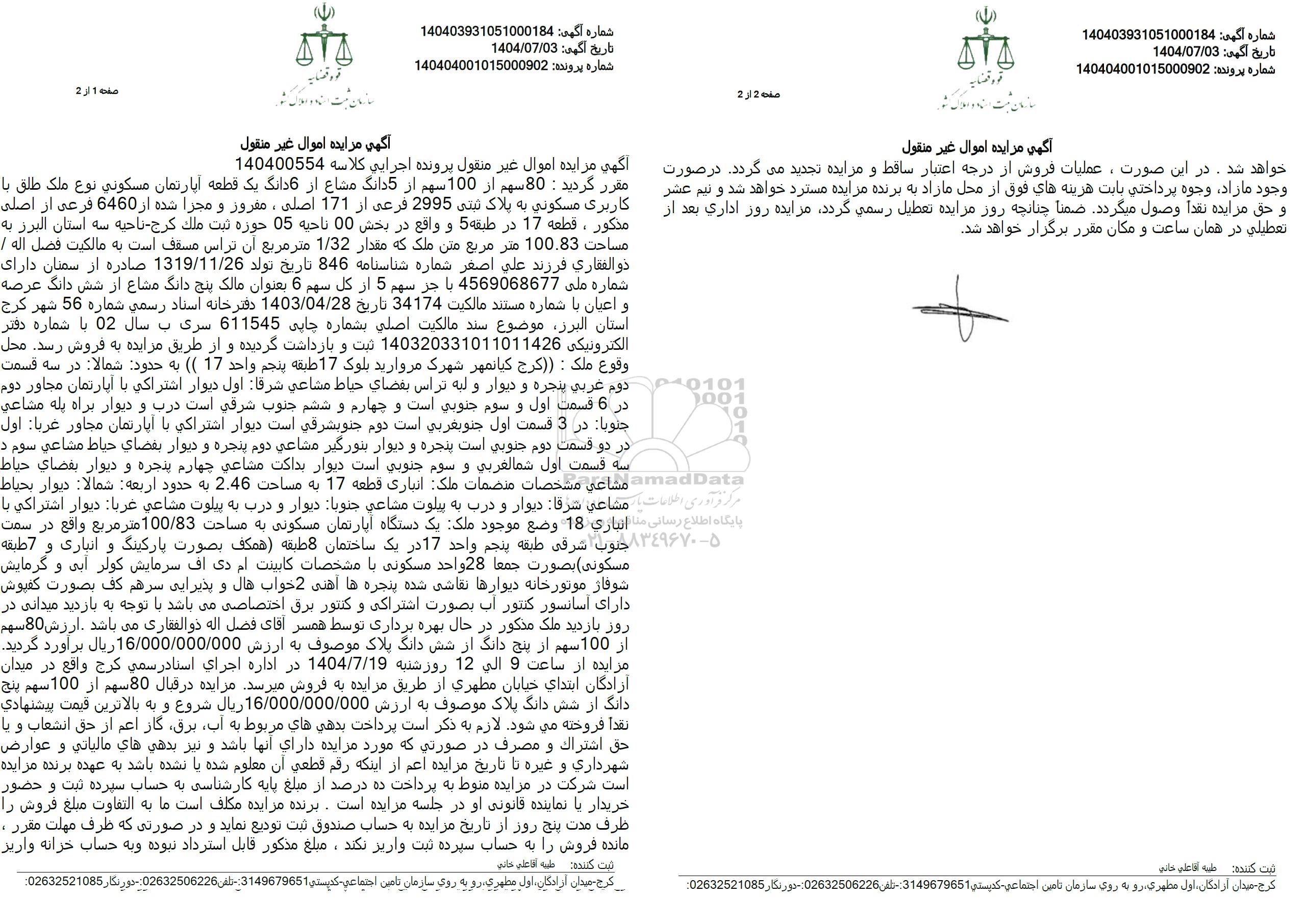 مزایده فروش 80 سهم از 100 سهم از 5 دانگ مشاع از 6 دانگ یک قطعه آپارتمان مسکونی نوع ملک طلق با کاربری مسکونی, مزایده فروش 80 سهم از 100 سهم از 5 دانگ مشاع از 6 دانگ یک قطعه آپارتمان مسکونی نوع ملک طلق با کاربری مسکونی
