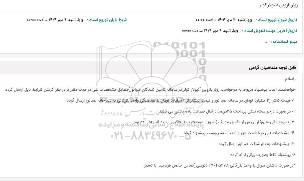 خواهشمند است پیشنهاد مربوط به درخواست رولر بازویی آنیولار کولر (در سامانه تامین کنندگان صبانور) مطابق مشخصات فنی در مدت مقرر با در نظر گرفتن شرایط ذیل ارسال گردد