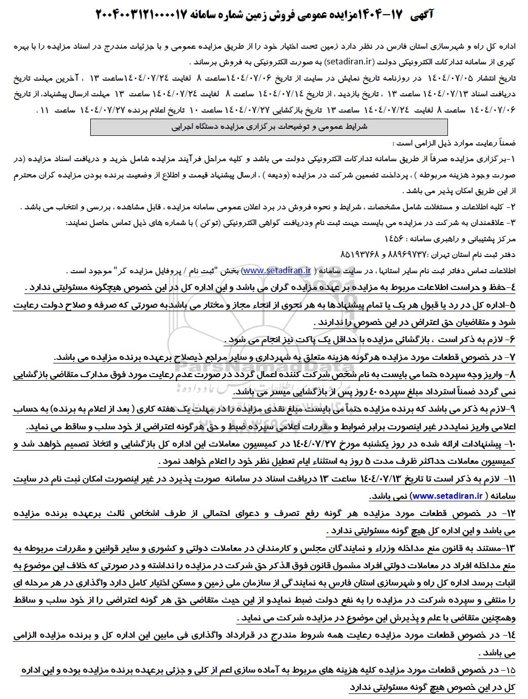 اداره کل راه و شهرسازی استان فارس در نظر دارد زمین تحت اختیار خود را از طریق مزایده عمومی و با جزئیات مندرج در اسناد مزایده را با بهره گیری از سامانه تدارکات الکترونیکی دولت (ستاد ایران) به صورت الکترونیکی به فروش برساند.