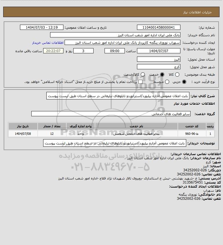 شرح کلی نیاز: بابت اعلان عمومی اجاره بیلبورد/استرابوردو تابلوهای تبلیغاتی در سطح استان طبق لیست پیوست