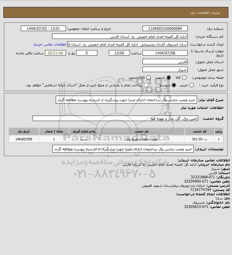 شرح کلی نیاز: خرید ونصب ترانس برق ساختمان ادارای صدرا جهت پیشگیری از اشتنباه پیوست مطالعه گردد