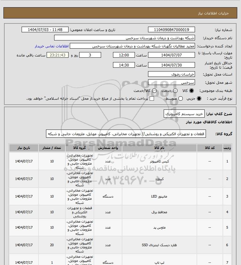 | 1 | -- | کیس کامپیوتر | عدد | تجهیزات مخابراتی، کامپیوتر، موبایل، ملزومات جانبی و شبکه | 10 | 1404/07/17 |
