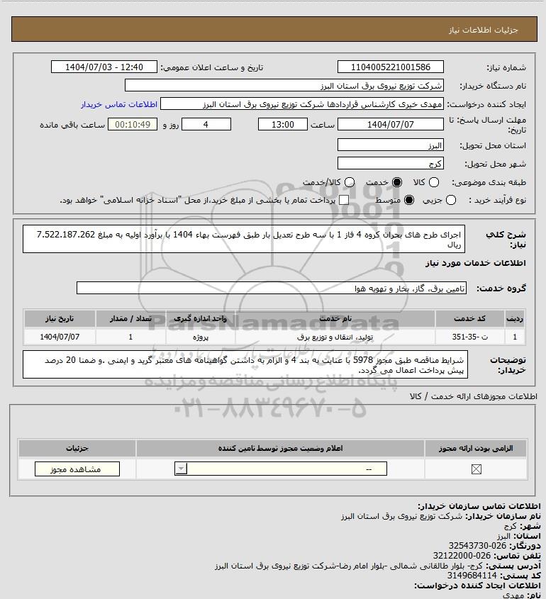 شرح کلی نیاز: اجرای طرح های بحران کروه 4 فاز 1 با سه طرح تعدیل بار طبق فهرست بهاء 1404 با برآورد اولیه به مبلغ 7.522.187.262 ریال