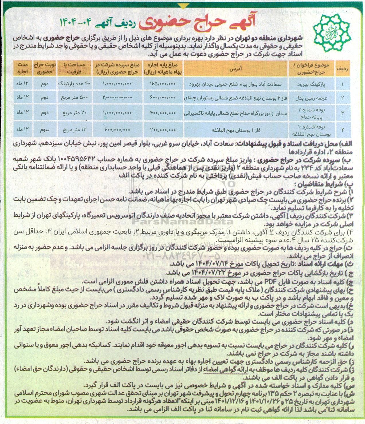 شهرداری منطقه دو تهران در نظر دارد بهره برداری موضوع های ذیل را از طریق برگزاری حراج حضوری به اشخاص حقیقی و حقوقی به مدت یکسال واگذار نماید. بدینوسیله از کلیه اشخاص حقیقی و یا حقوقی واجد شرایط مندرج در اسناد جهت شرکت در حراج حضوری دعوت به عمل می آید.