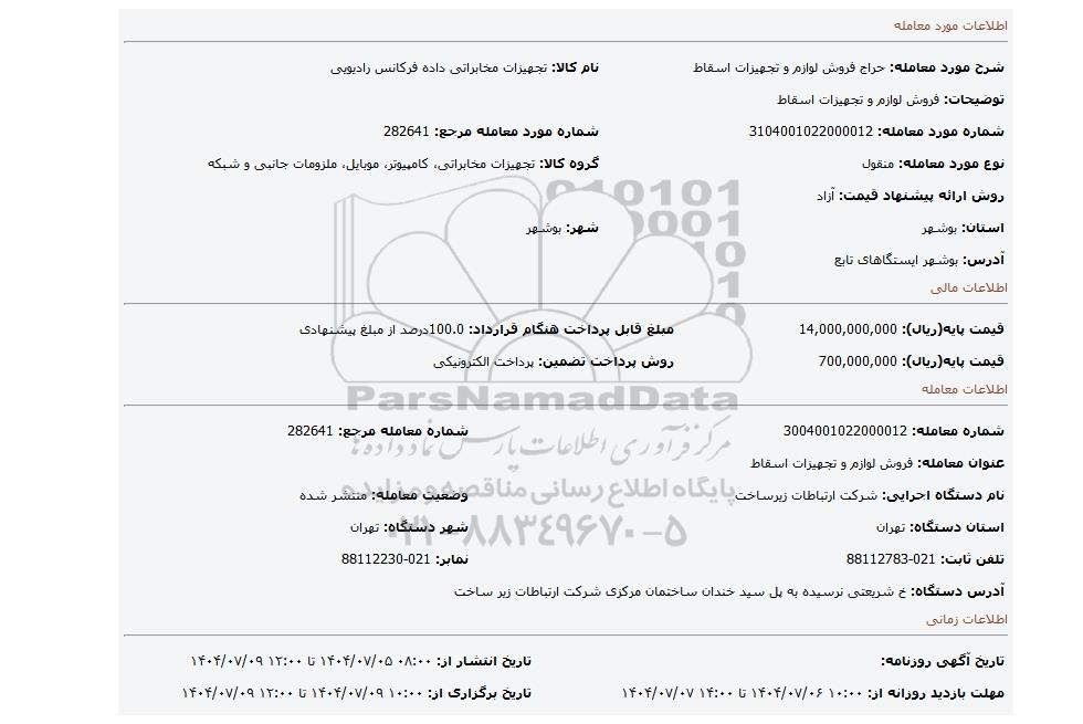 | شرح مورد معامله: حراج فروش لوازم و تجهیزات اسقاط | نام کالا: تجهیزات مخابراتی داده فرکانس رادیویی | |